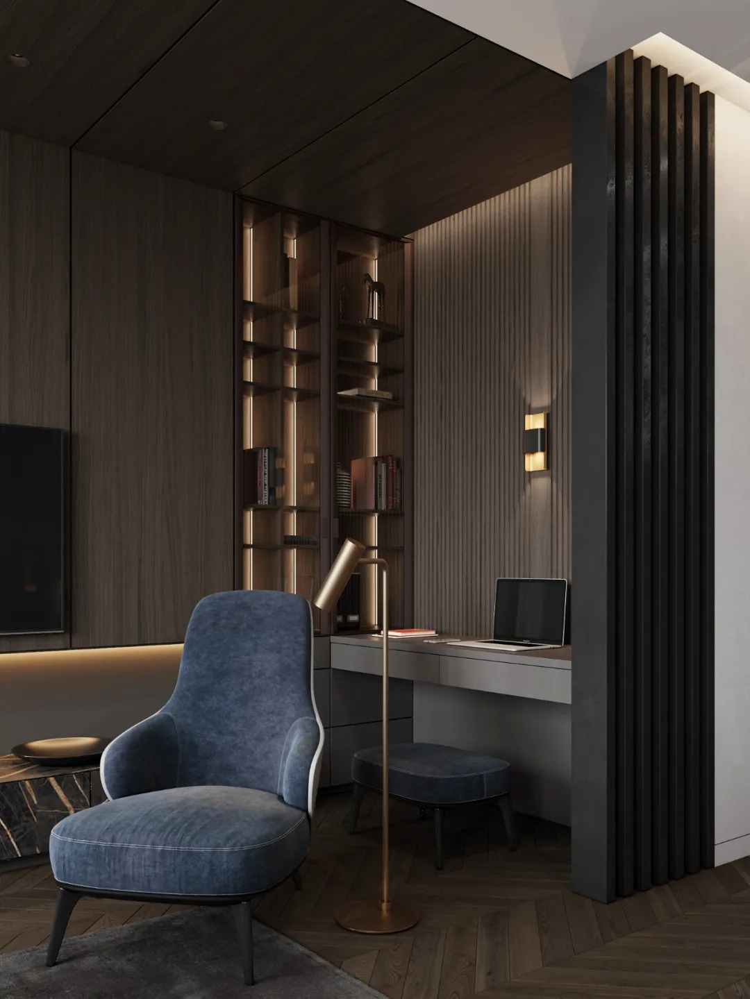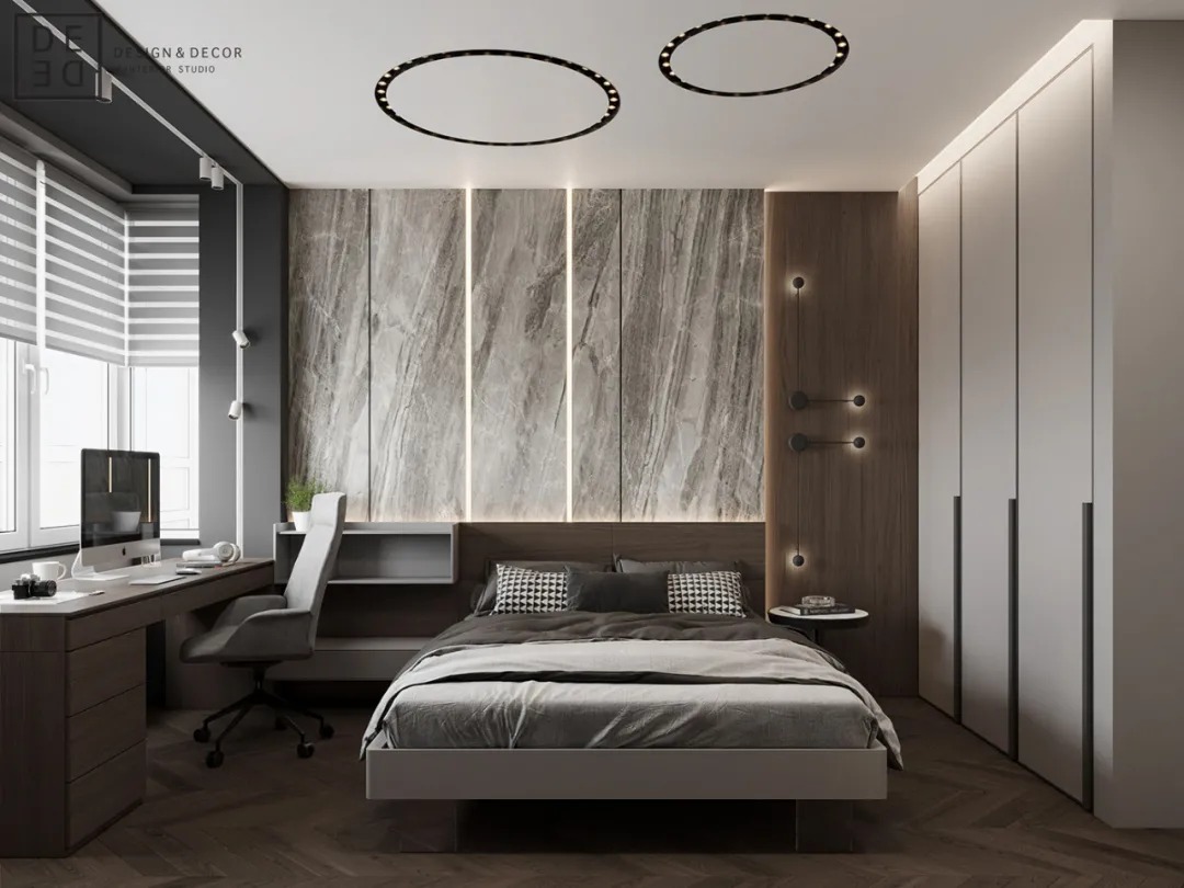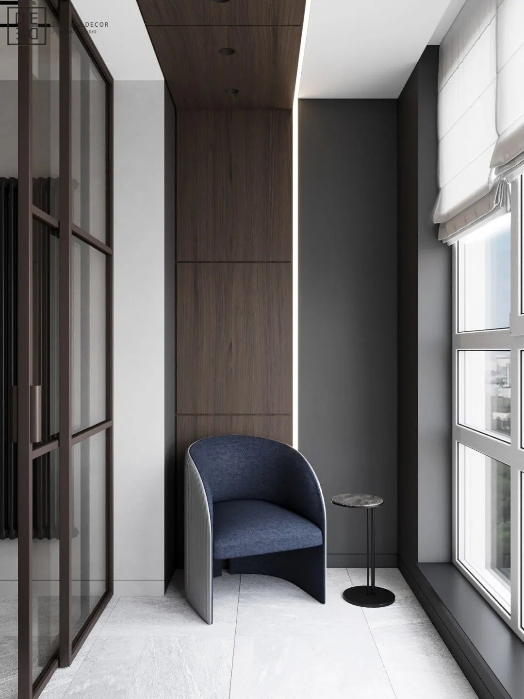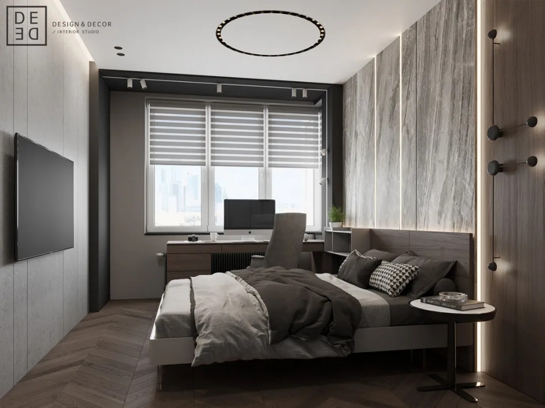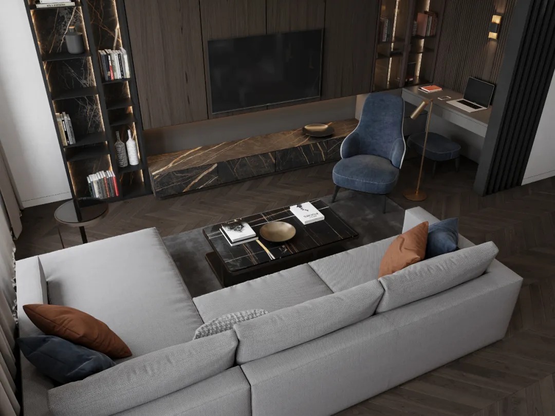 总面积为130平方米。室内以深灰、浅灰、蓝色穿插交错于整个空间,加入石材与胡桃木多重材质碰撞打造出沉静现代的魅力空间。空间部分灯饰采用藏于墙内的细长灯带,散发闪耀温暖的光线精致了空间的硬朗线条,让空间看起来有着不一样的奢华高级感。小小的阳台部分也被设计得高级舒适,简约不带一条多余的线条与装饰,全包式的玻璃窗引入充足的光线,木板从天花顶垂落的墙面,静谧惬意的感觉被呈现于阳台空间。