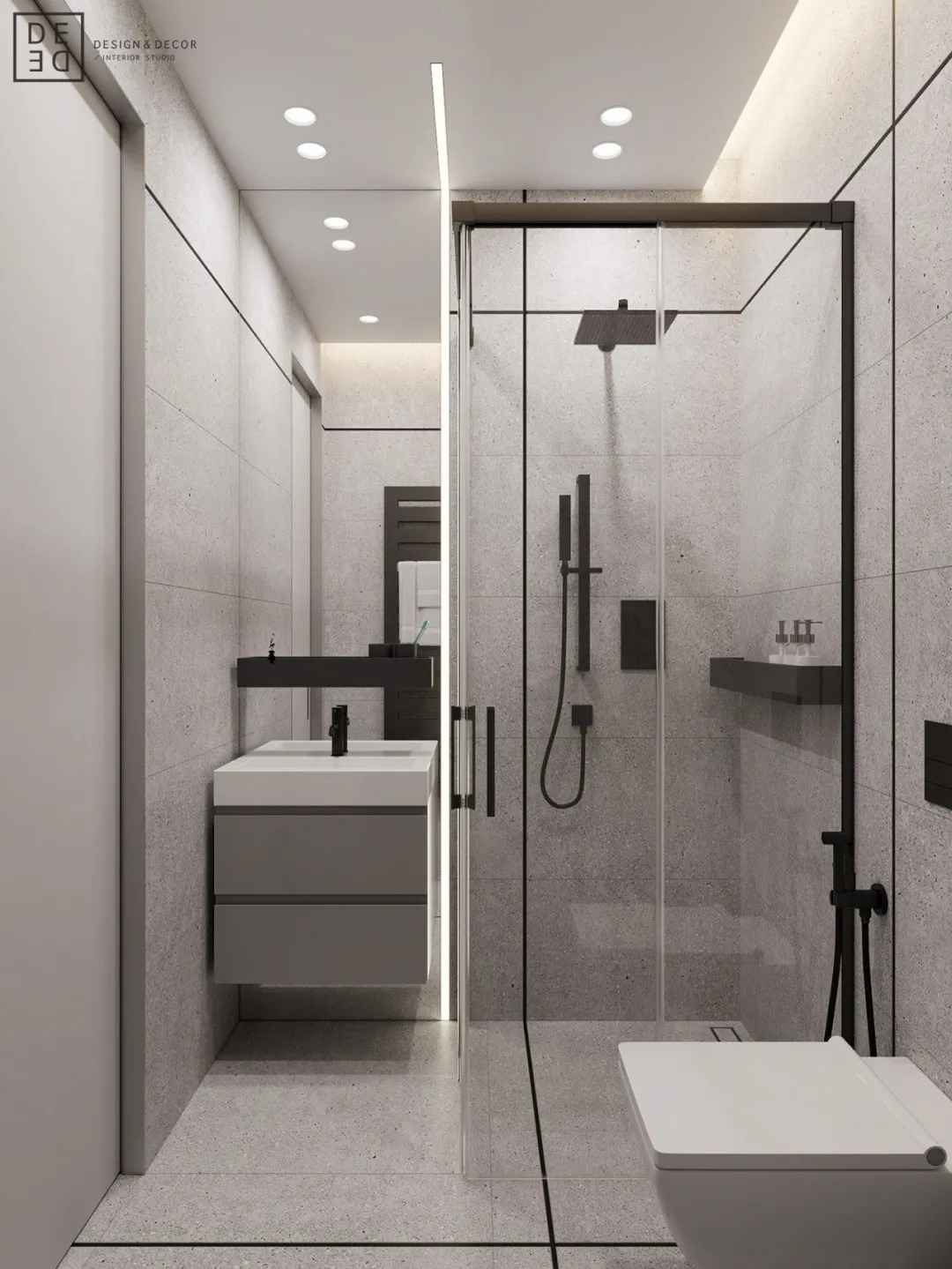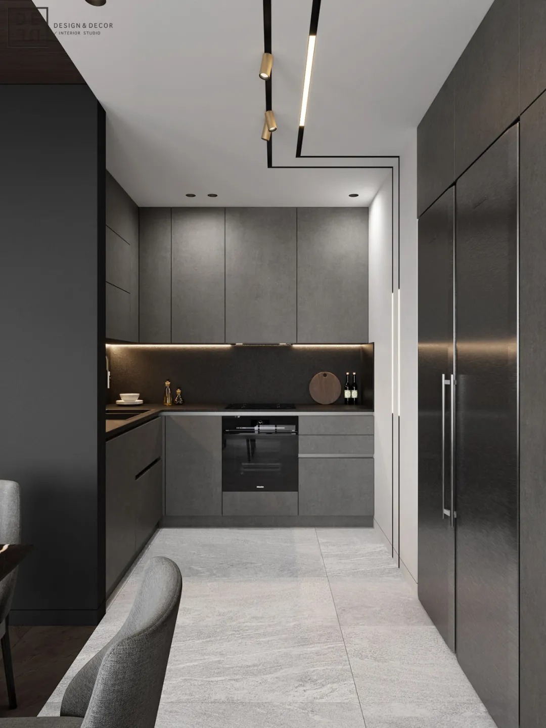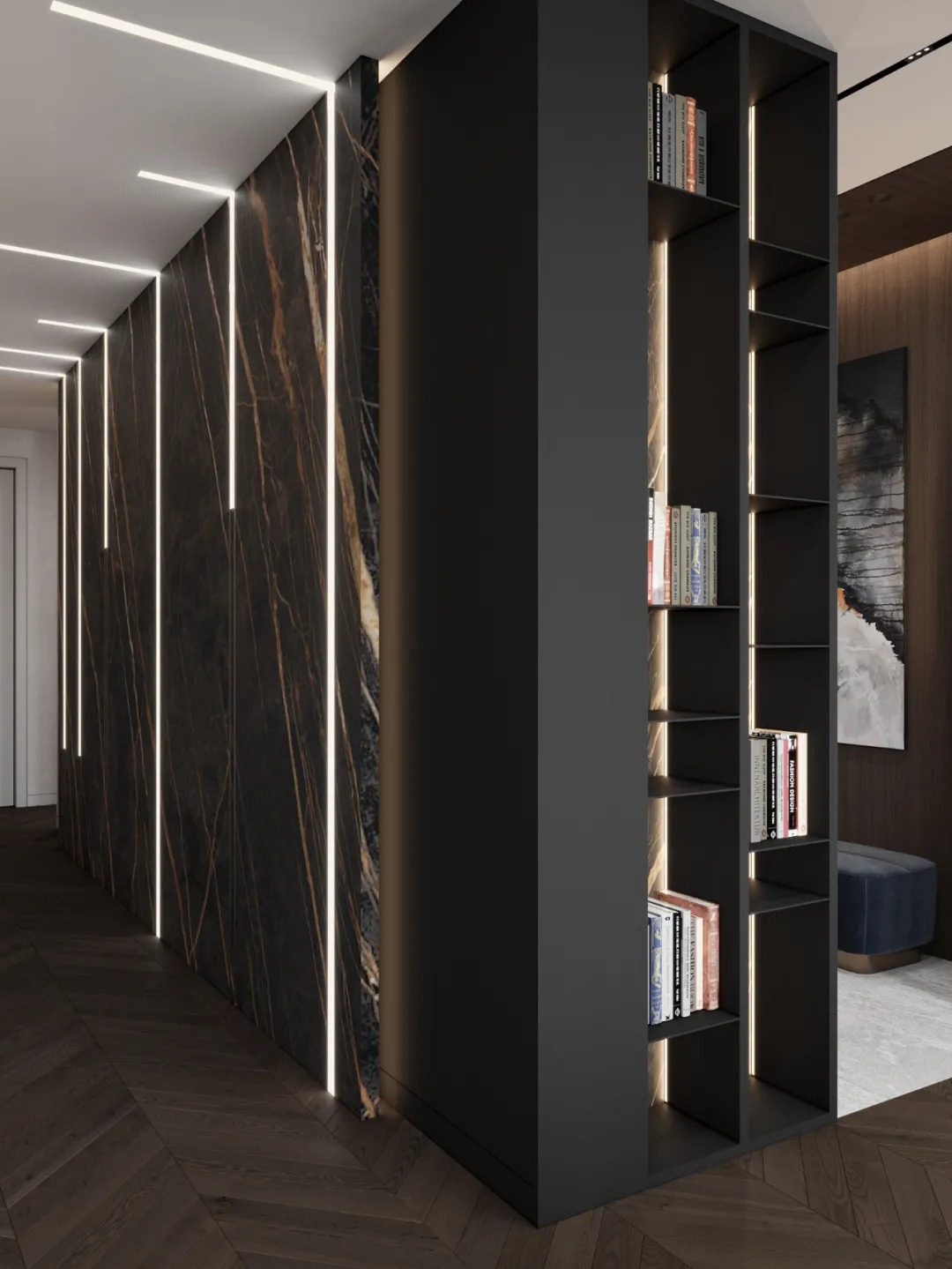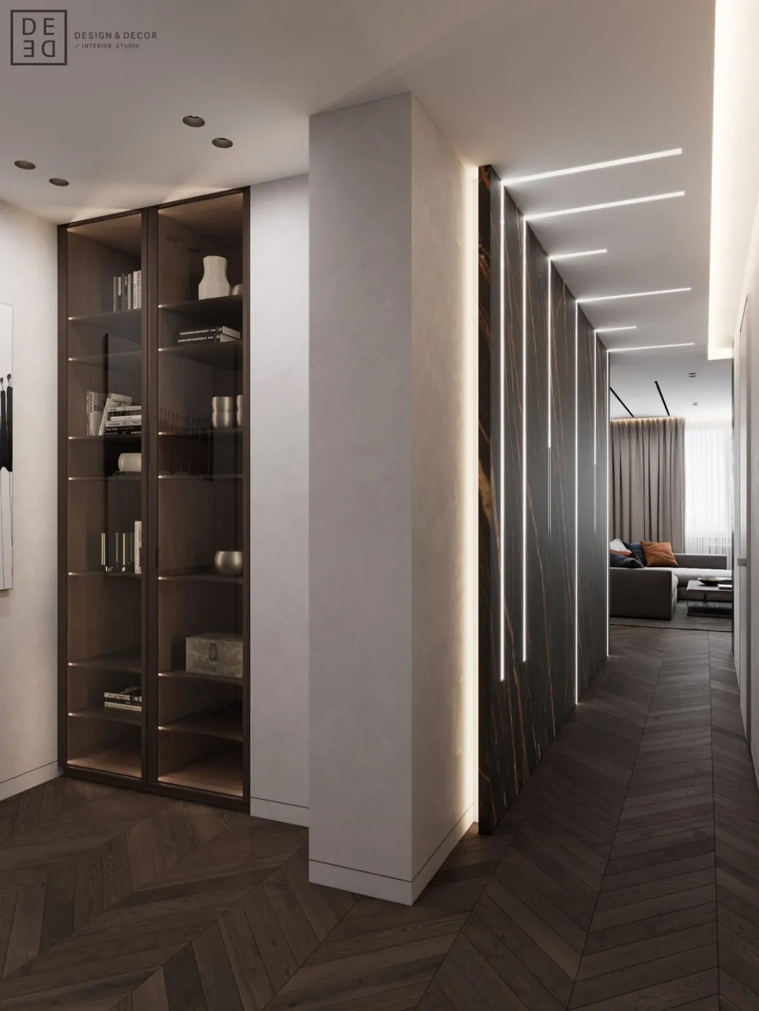 总面积为130平方米。室内以深灰、浅灰、蓝色穿插交错于整个空间,加入石材与胡桃木多重材质碰撞打造出沉静现代的魅力空间。空间部分灯饰采用藏于墙内的细长灯带,散发闪耀温暖的光线精致了空间的硬朗线条,让空间看起来有着不一样的奢华高级感。小小的阳台部分也被设计得高级舒适,简约不带一条多余的线条与装饰,全包式的玻璃窗引入充足的光线,木板从天花顶垂落的墙面,静谧惬意的感觉被呈现于阳台空间。